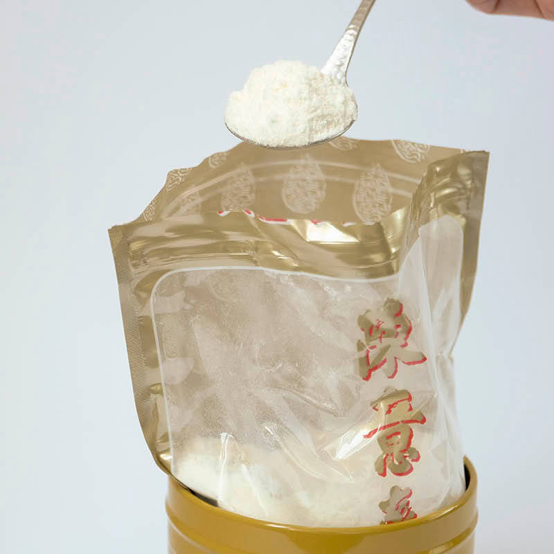 陳意齋的杏仁霜,標榜不下杏仁香油,杏仁、川貝磨得細細地,混入糖、粟粉、奶粉。杏仁還要以膠州甜南杏、加入小許天津苦北杏,跟足古方:「杏仁茶,所用為甜仁,然必入苦仁數枚,以發其香。」