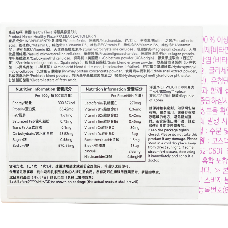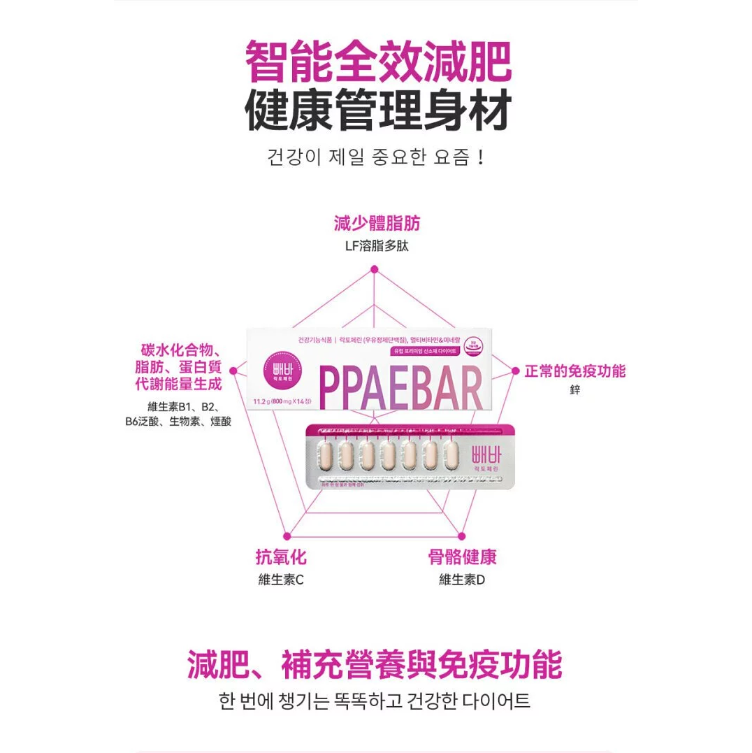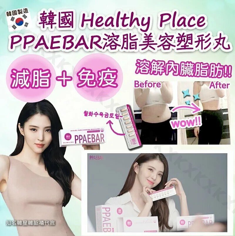 產地: 韓國 一天一顆,建議清晨醒來或睡前空腹使用,伴溫水送服即可。 一般4盒為一個療程 韓國Healthy Place PPAEBAR美容塑形片 ✅韓國首創配方,韓韶禧瘦身秘訣,有效內臟溶脂 ✅創新成分,減脂+免疫 二合一,健康減肥兩不誤 ✅獨家服用包裝,幫助養成服用習慣,持續療效 ✅有效祛除內臟多餘脂肪,不僅減重,也能抗三高