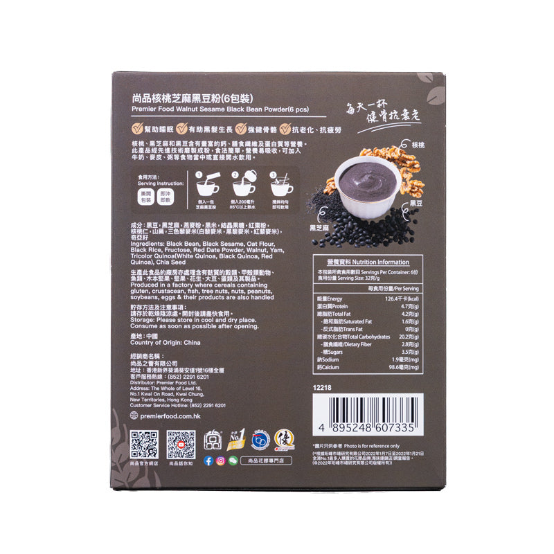 成分:黑豆、黑芝麻、燕麥粉、黑米、結晶果糖、紅棗粉、核桃仁、山藥、三色藜麥米(白藜麥米、黑藜麥米、紅藜麥米)、奇亞籽