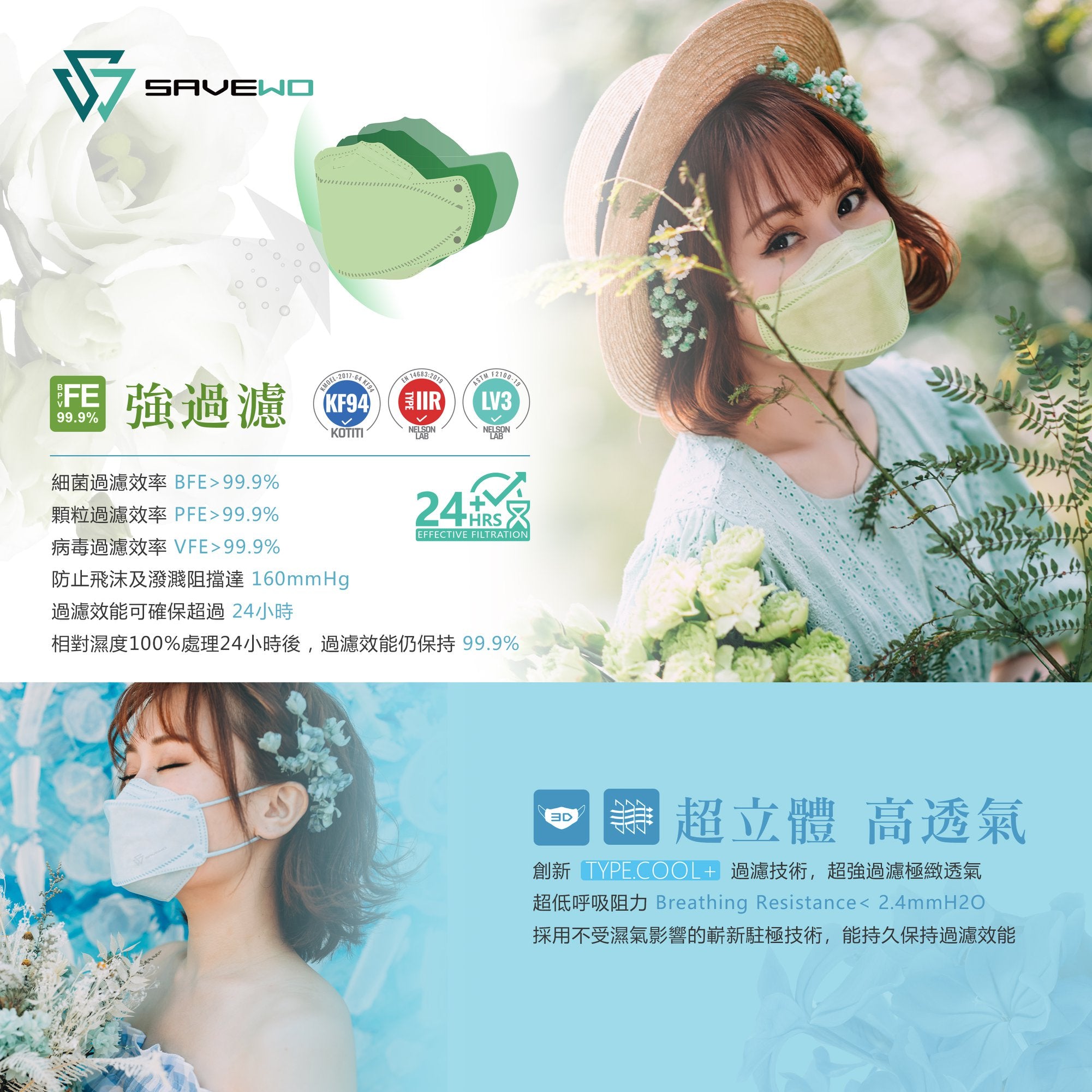 沿用5種精心調配的花樣色彩,讓您可以隨心配搭喜好,時尚抗疫。採用SAVEWO TypeCool+ 過濾技術,有效過濾99.9%細菌、微塵及病毒,持續效能長達24小時。呼吸阻力Breathing 低於 2.4mmH2O,並符合韓國KF94及美國ASTM Level3規格。