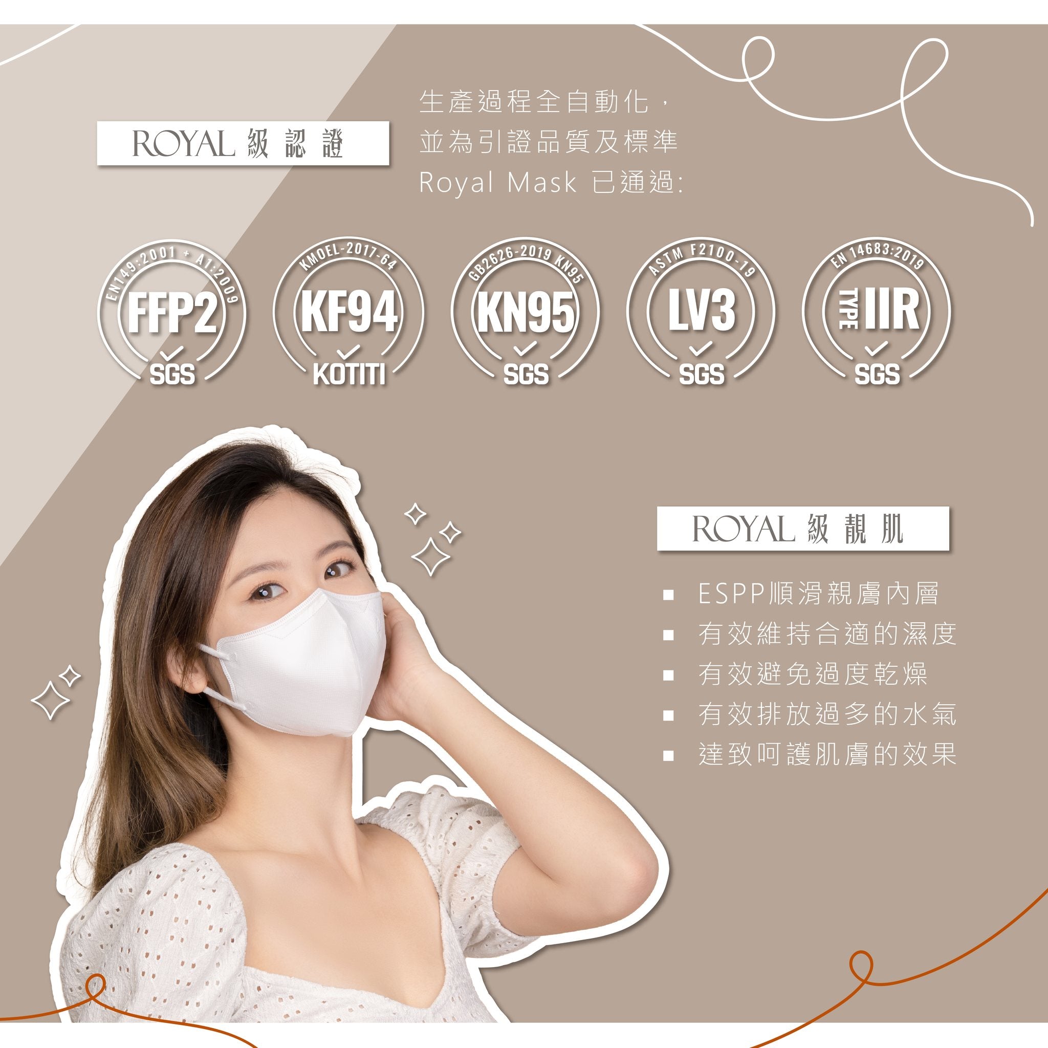 生產過程全自動化,並為引證品質及標準,Royal Mask 已通過韓國KF94、中國 KN95、美國ASTM Level 3、歐盟TYPE IIR認證,防禦度有所保證。