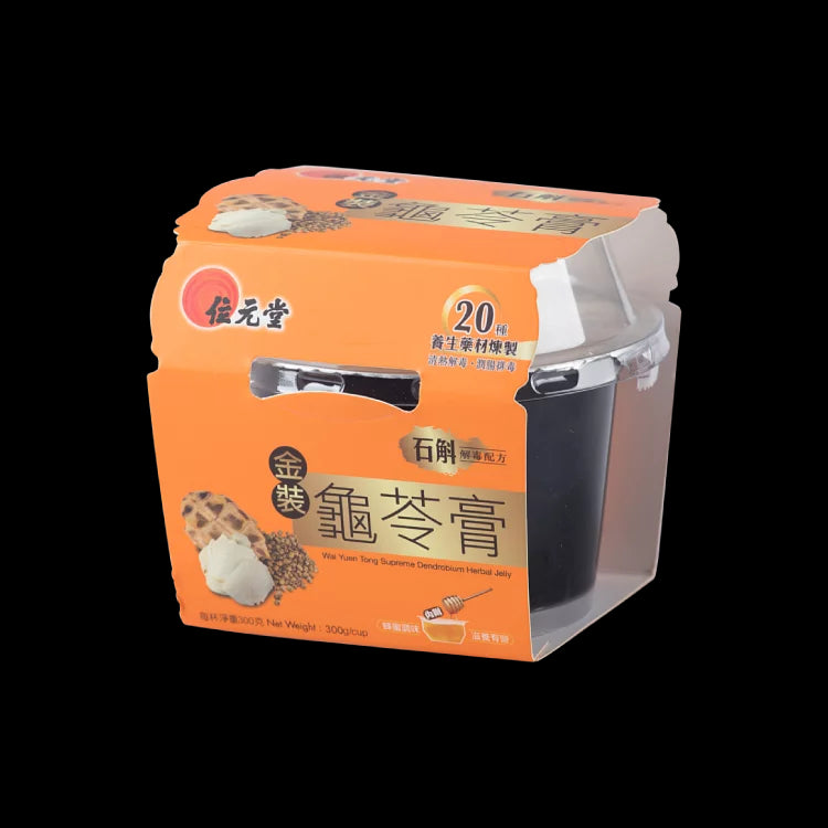 位元堂金裝龜苓膏(石斛解毒配方)集20種優質中藥材,以獨特秘方精製而成。特設獨立蜂蜜糖杯,滋潤有營養,可依個人口味調整添加份量。專業中醫師研配、通過微生物測試、絕無添加防腐劑、色素