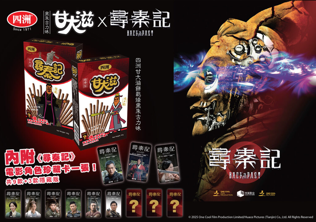 甘大滋 x《 尋秦記電影版 》 打造期間限定黑朱古力味甘大滋餅乾條,並隨盒特別附送《 尋秦記電影版 》角色珍藏卡,勢掀零食及影迷熱話。