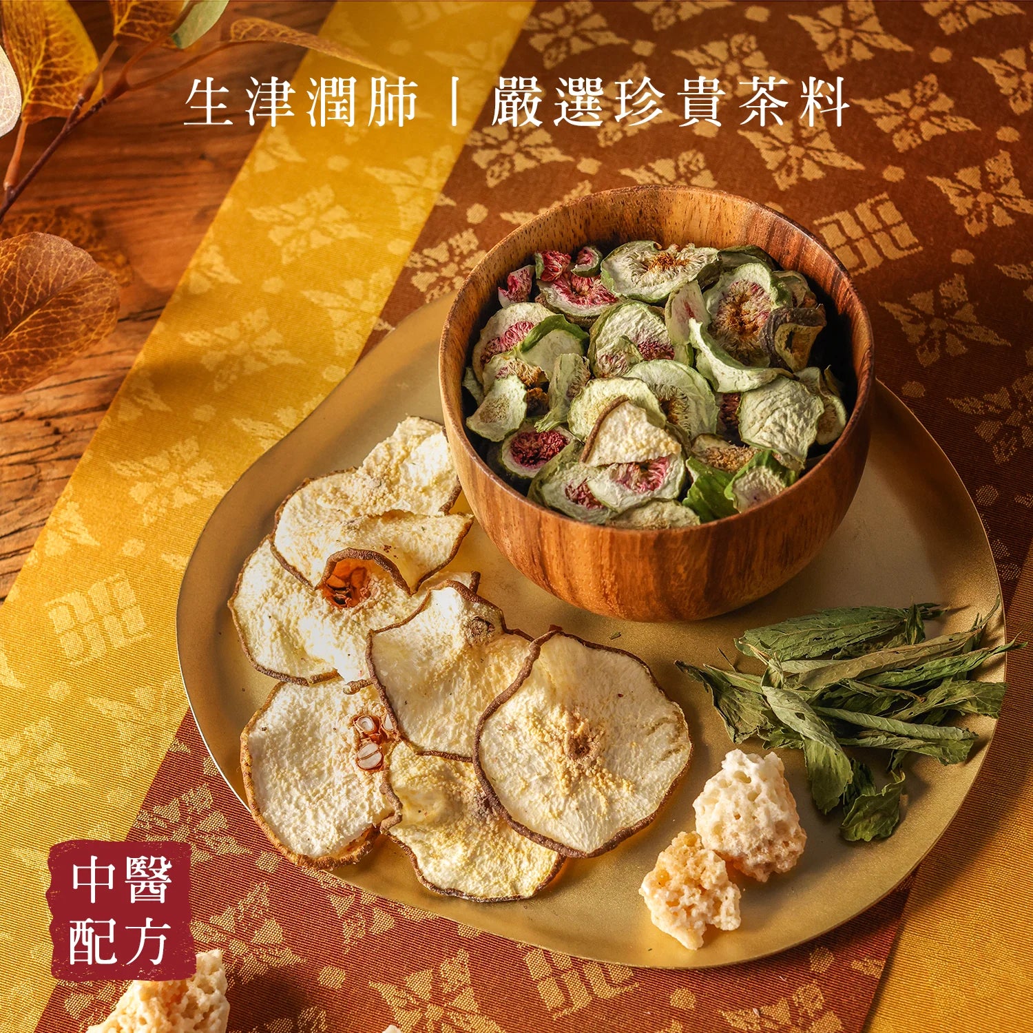 茶方經由中醫專業調配,針對由流感引起的咳嗽問題,有效止咳化痰、紓緩喉嚨乾涸等流感不適症狀,增強身體免疫力。無花果香氣配上甜潤石蜂糖及原片雪梨乾,味道甘甜好飲,止咳不再飲苦茶。