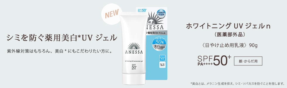 | 預防色斑的藥用美白防曬啫喱 ,添加可以抑制黑色素生成,預防色斑和雀斑的美白有效成分“ m-tranexamic acid”。並且添加了50%的嚴格甄選的護膚成分。為肌膚賦予滋潤,對乾燥帶來的傷害進行護理。 *美白是指抑制黑色素生成,防止產生色斑和雀斑。 |