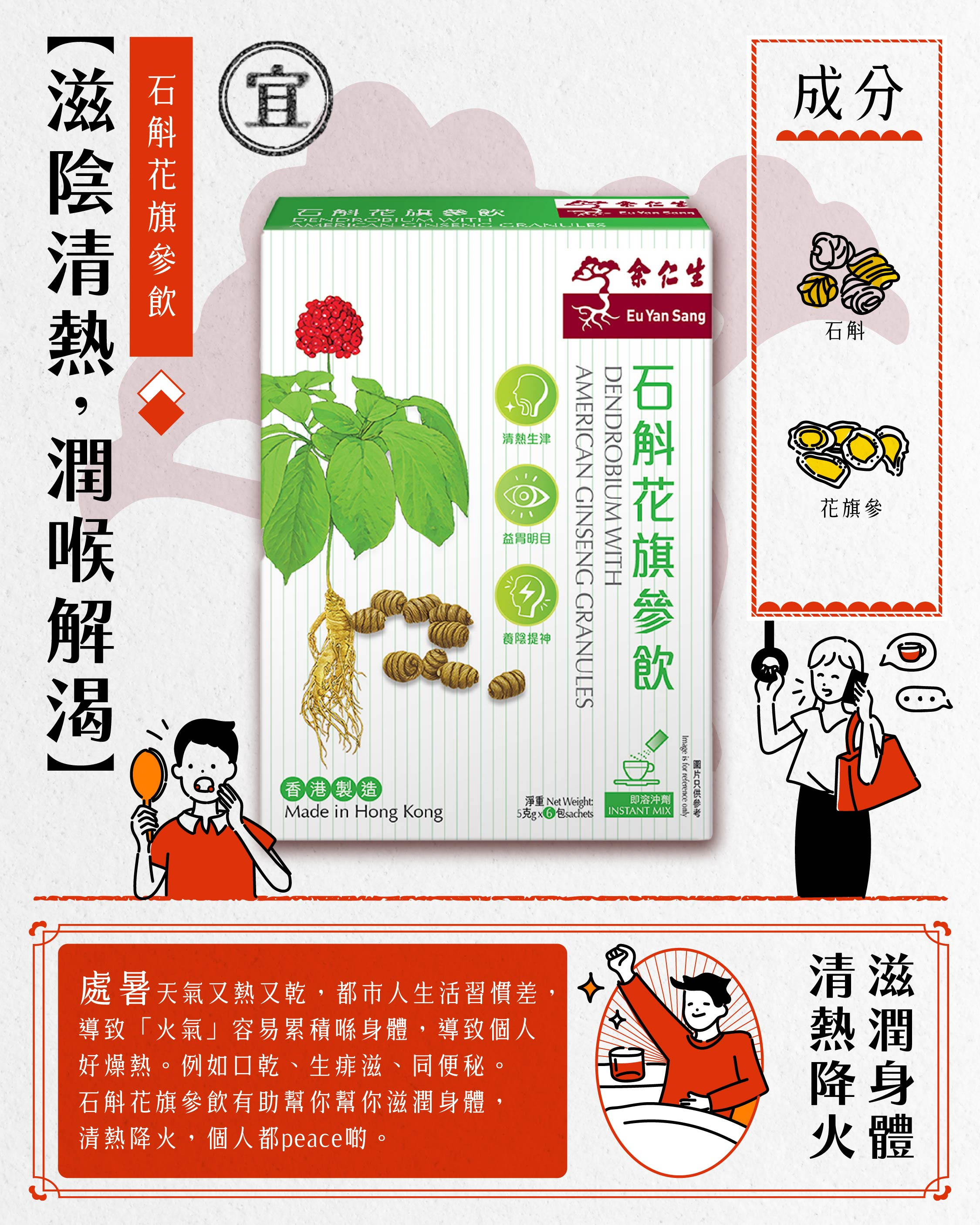 American Ginseng: Improve vital energy, strengthen the yin-essences, clear internal heat and promote body fluid.
