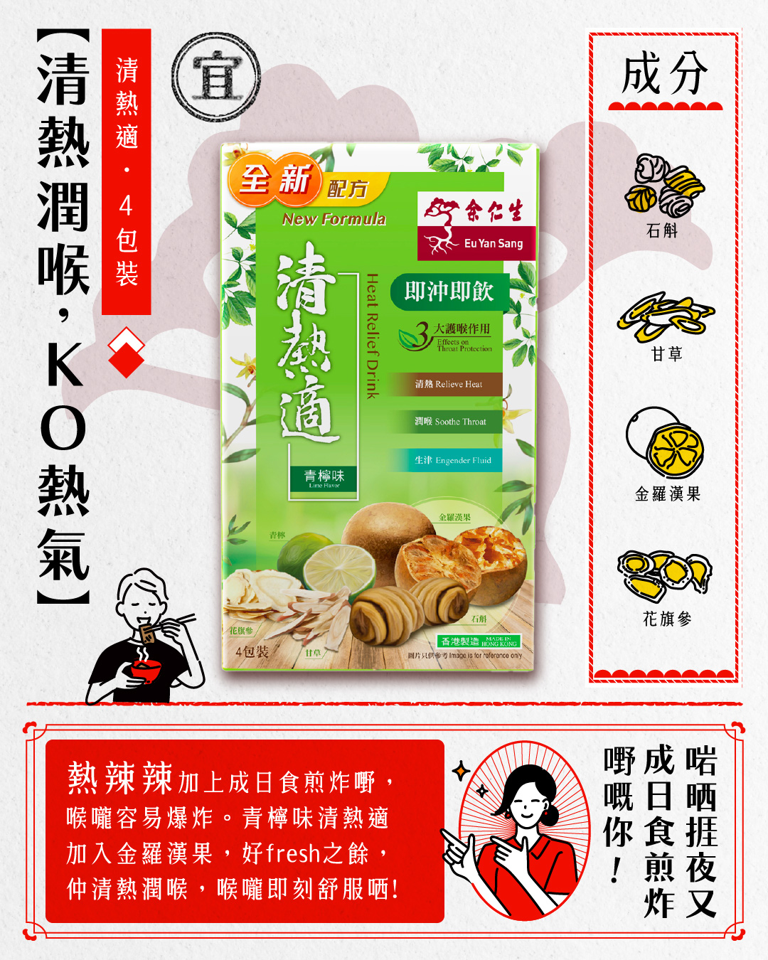 甘草、乳糖、青檸粉、花旗參、石斛、麥芽糊精、金羅漢果、 薄荷、薄荷腦 (生產此產品的廠房亦處理含有麩質的穀類、甲殼類動物、蛋類、魚類、花生、大豆、奶類、木本堅果及堅果製品。)