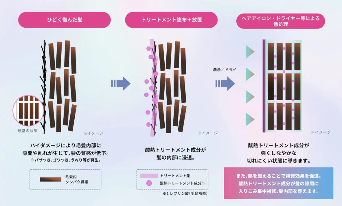 "Acid heat treatment" refers to a hair treatment that uses acidic hair repair ingredients to intensively repair accumulated damage from coloring, irons, and other treatments, helping to restore the hair to a soft and beautiful condition.