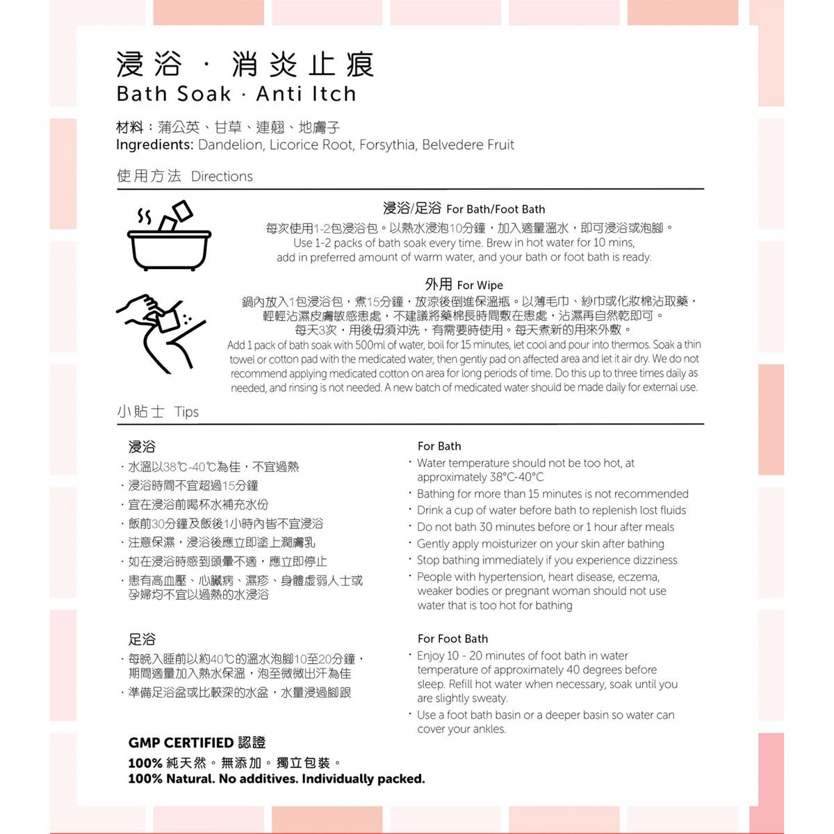 鍋內放入1包浸浴包,煮15分鐘,放涼後倒進保溫瓶。以薄毛巾、紗巾或化妝棉沾取藥,輕輕沾濕皮膚敏感患處,不建議將藥棉長時間敷在患處,沾濕再自然乾即可。每天3次,用後毋須沖洗,有需要時使用。每天煮新的用來外敷。