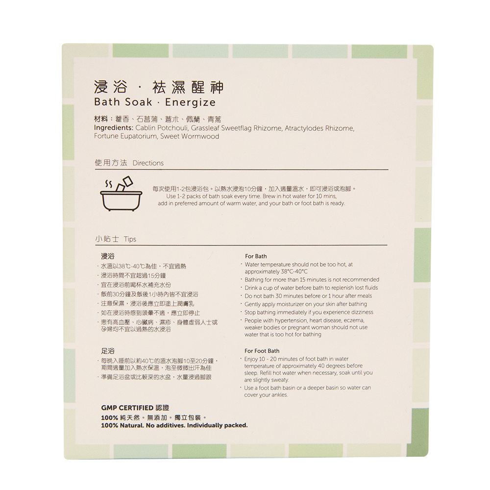 每次使用1-2包浸浴包。以熱水浸泡10分鐘,加入適量溫水,即可浸浴或泡腳。
