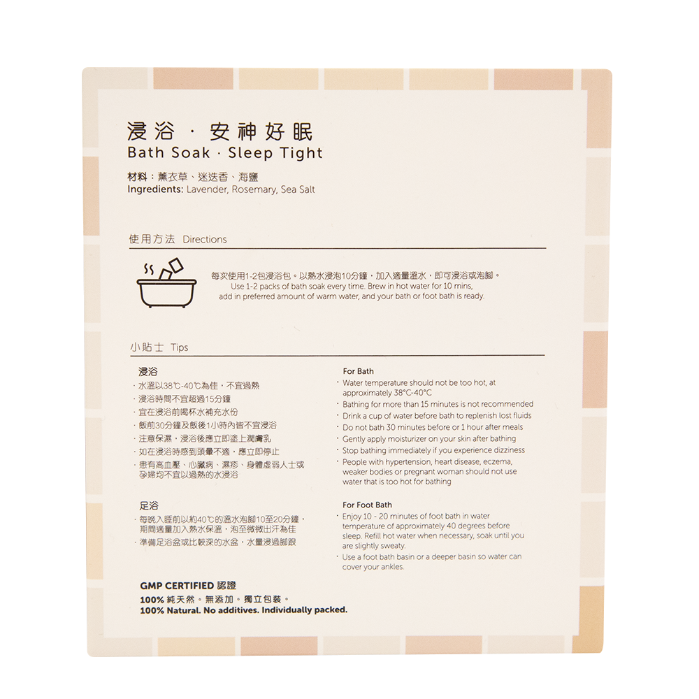 每次使用1-2包浸浴包。以熱水浸泡10分鐘,加入適量溫水,即可浸浴或泡腳。