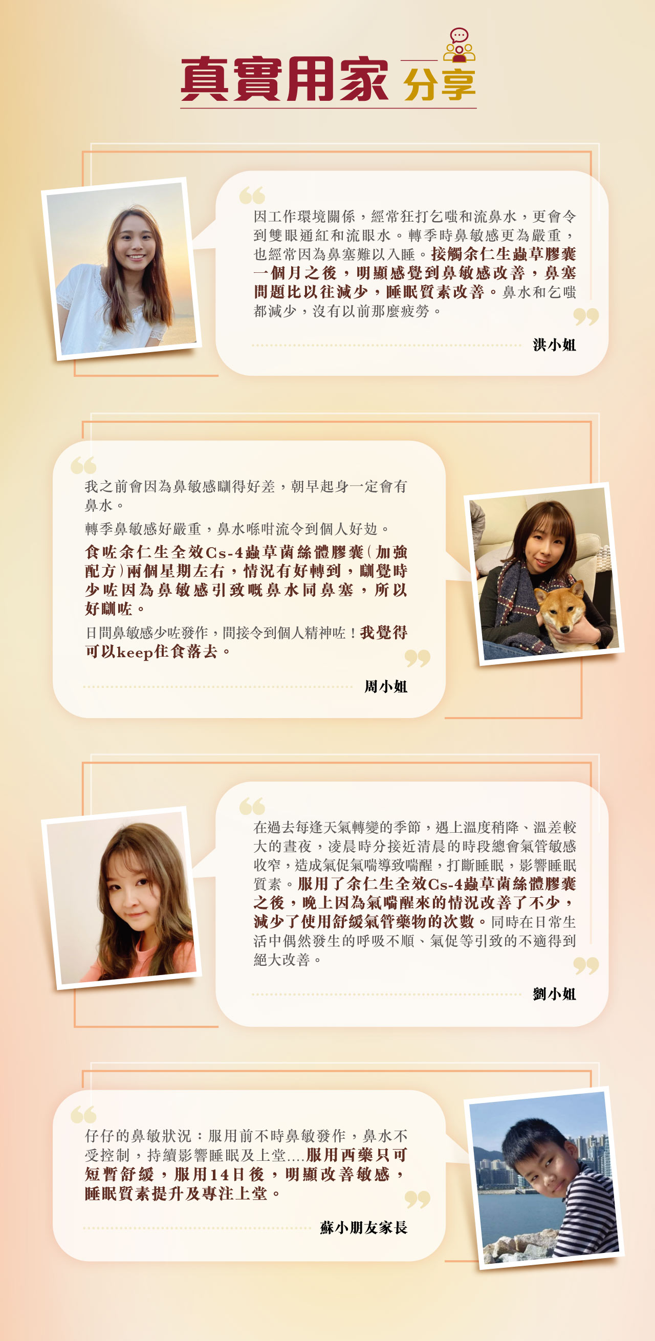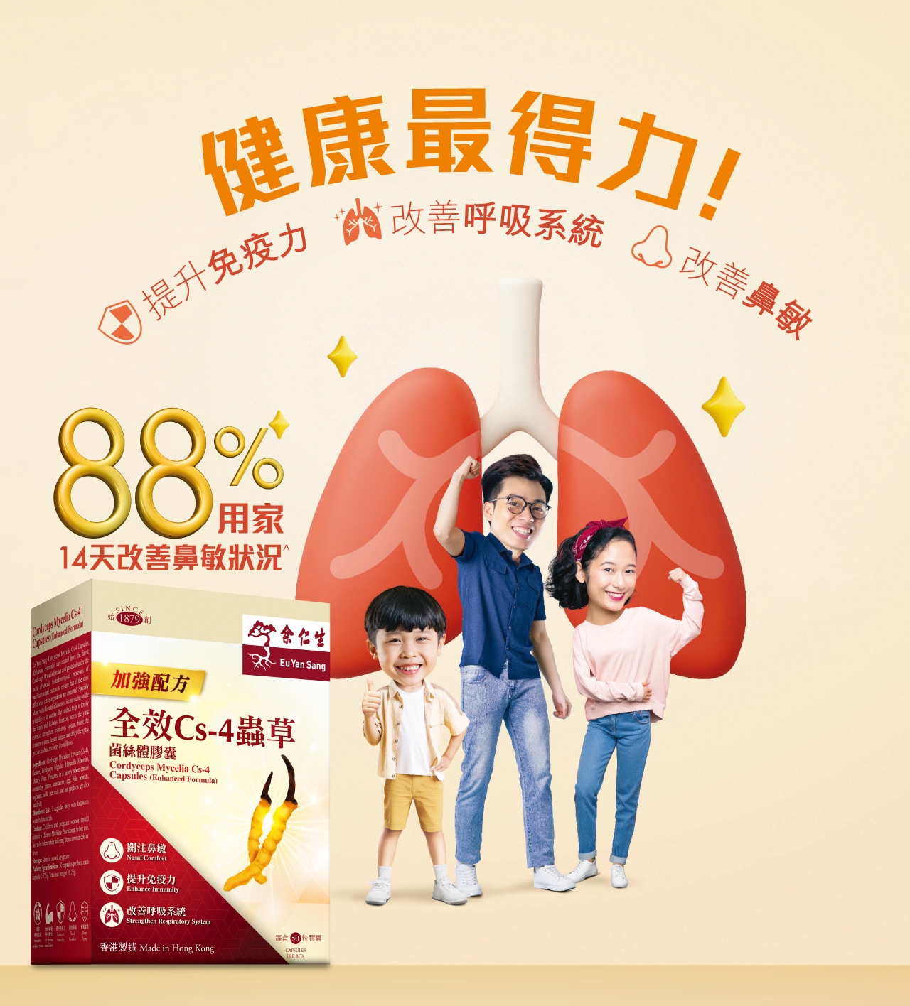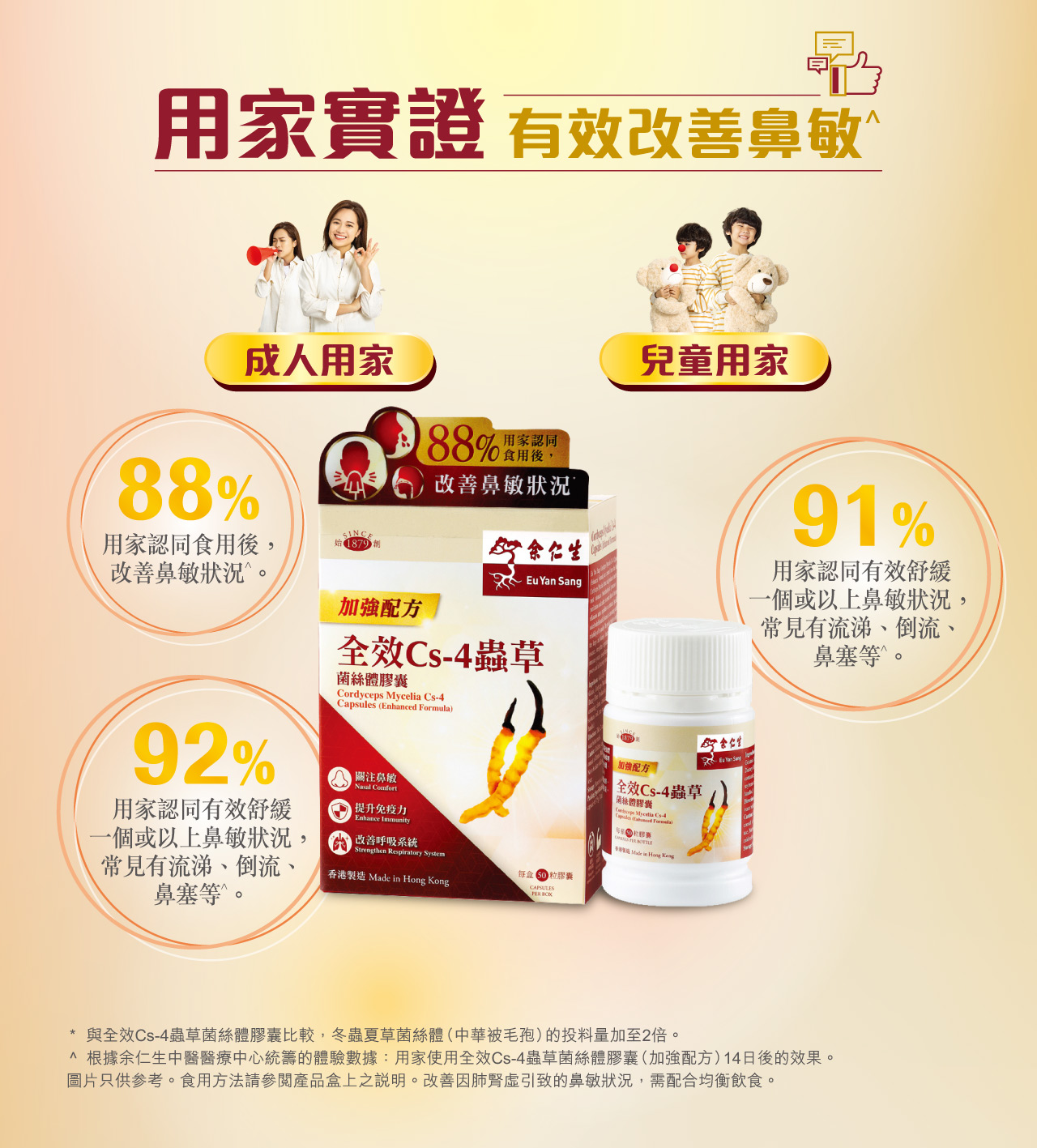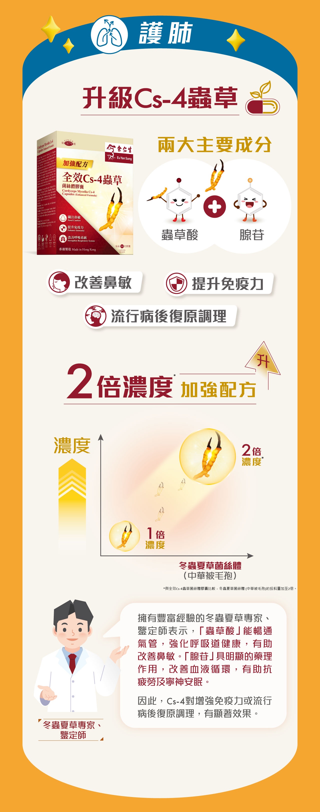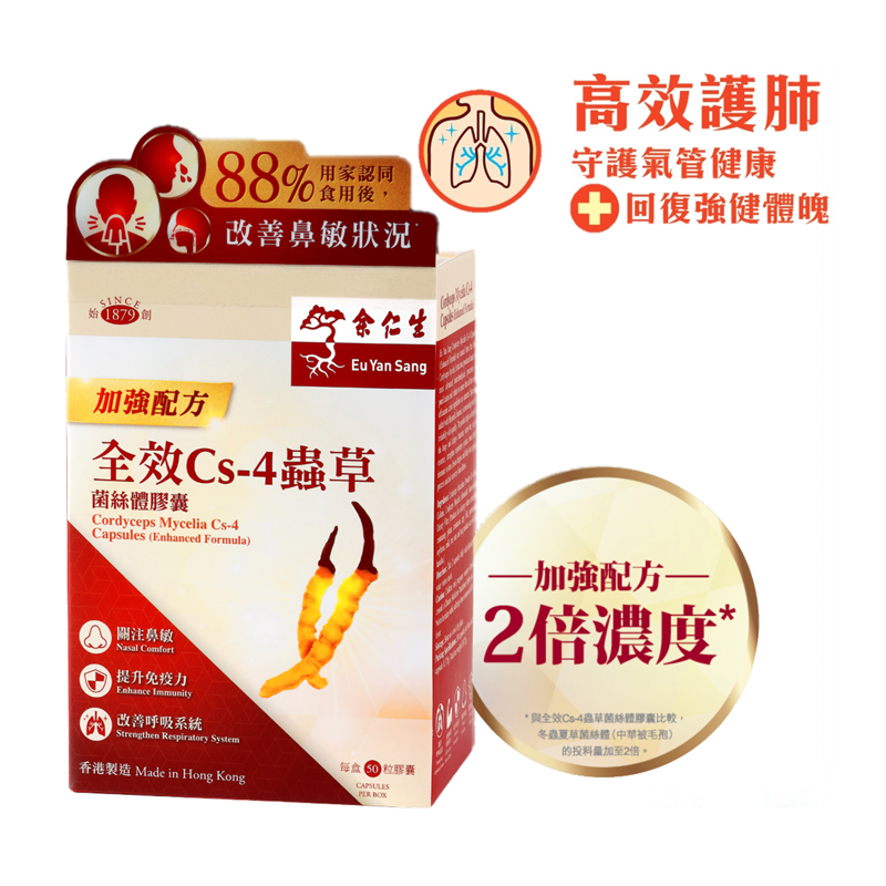 全效Cs-4蟲草菌絲體膠囊 (加強配方) 本品是採用優質冬蟲夏草原生種分離出的蟲草 菌絲體(Cs-4),經純化、培養及採用現代生物工程 技術,提取其中主要生物活性成分精製而成。特別 加入「中華被毛孢」,質素更有保證。本產品能補腎益肺,溫補腎陽,可改善呼吸系統功能,增強免疫力,消除疲勞,延緩衰老及加速病後恢復體力。