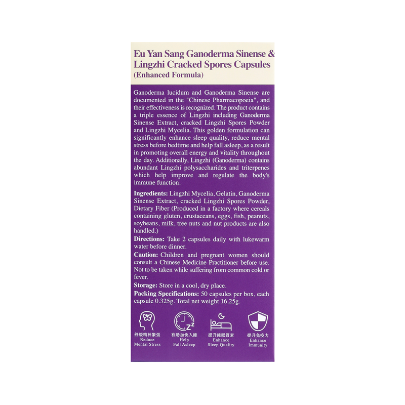 Eu Yan Sang Ganoderma lucidum and Ganoderma Sinense are documented in the "Chinese Pharmacopoeia," and their effectiveness is recognized. The product contains a triple extract of Lingzhi including (Ganoderma) essence, including Ganoderma Sinense Extract, cracked Lingzhi Spores Powder and Lingzhi Mycelia. This golden formulations can significantly enhance sleep quality, reduce mental stress before bedtime and help fall asleep, as a result in promoting overall energy and vitality throughout the day. Additionally, Lingzhi (Ganoderma) contains abundant Lingzhi polysaccharides and triterpenes which help improve and regulate the body's immune function.