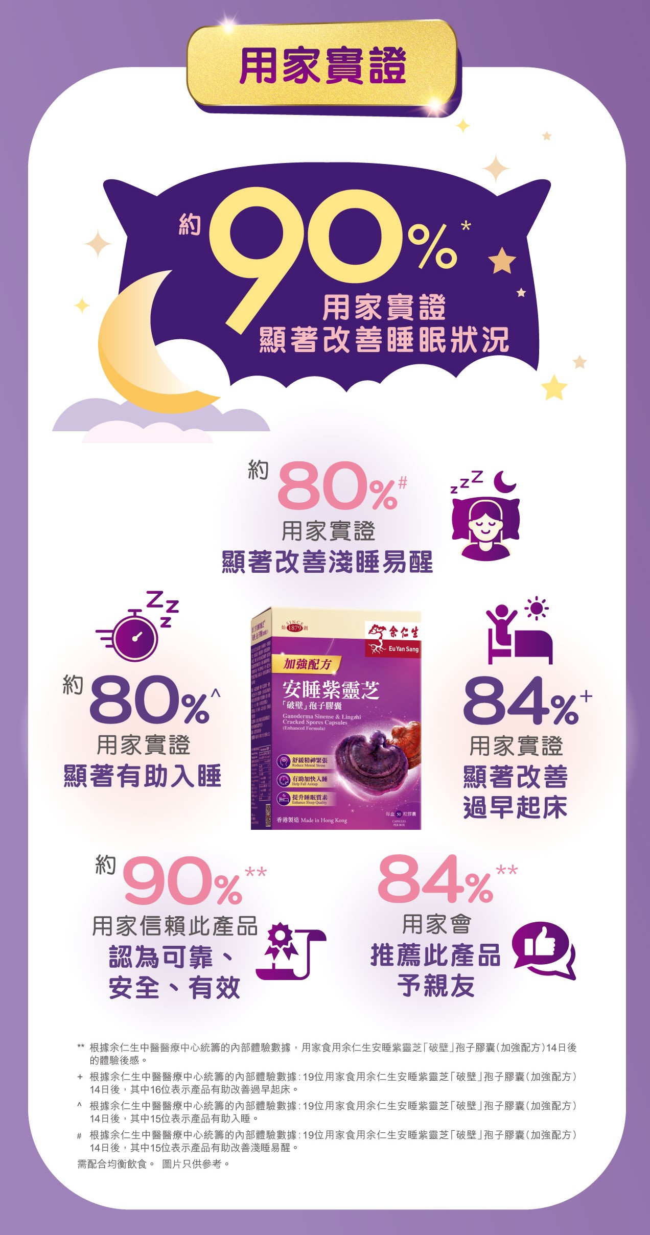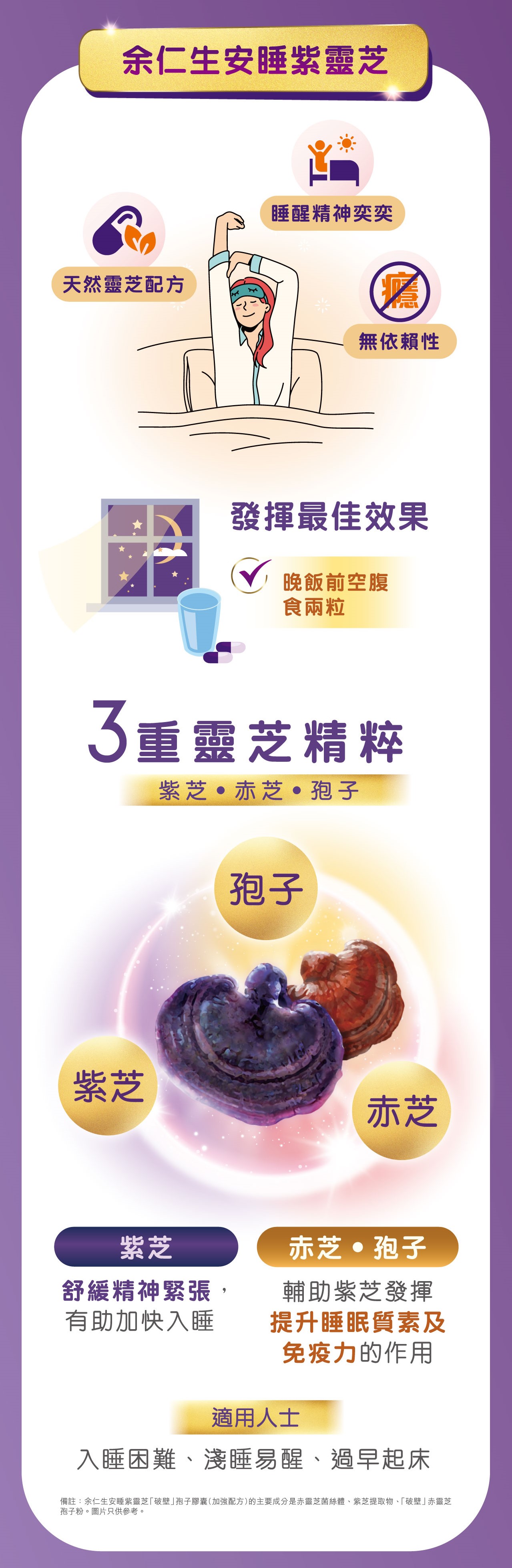 紫芝及赤芝是被記載於《中國藥典》,效用備受肯定。此產品蘊含三重靈芝精粹,包括紫芝提取物﹑ 赤靈芝「破壁」孢子粉及赤靈芝菌絲體,此黃金配搭能顯著提升睡眠質素,舒緩入睡前精神緊張,有助加快入睡,令每天精神充沛。另外,靈芝含有豐富靈芝多醣及三萜類元素,有助改善及調節人體免疫功能。