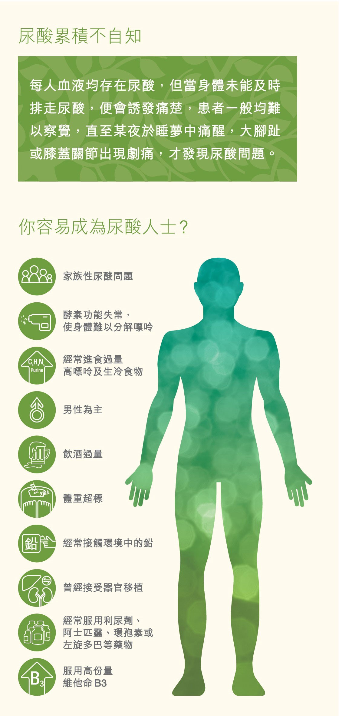 尿酸累積不自知每人血液均存在尿酸,但當身體未能及時排走尿酸,便會誘發痛楚。患者一般難以察覺,直至某夜於夢中痛醒,大腳趾或膝關節出現劇痛,才發現尿酸問題。