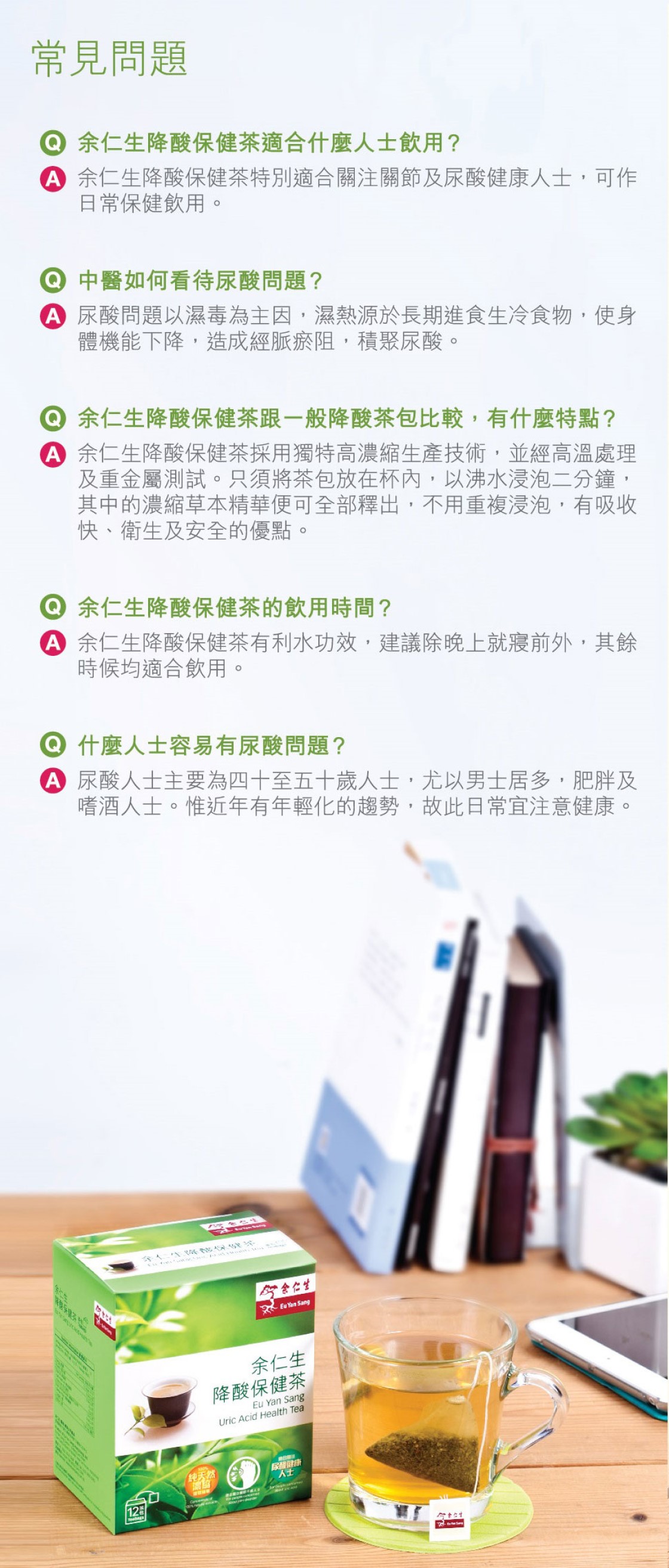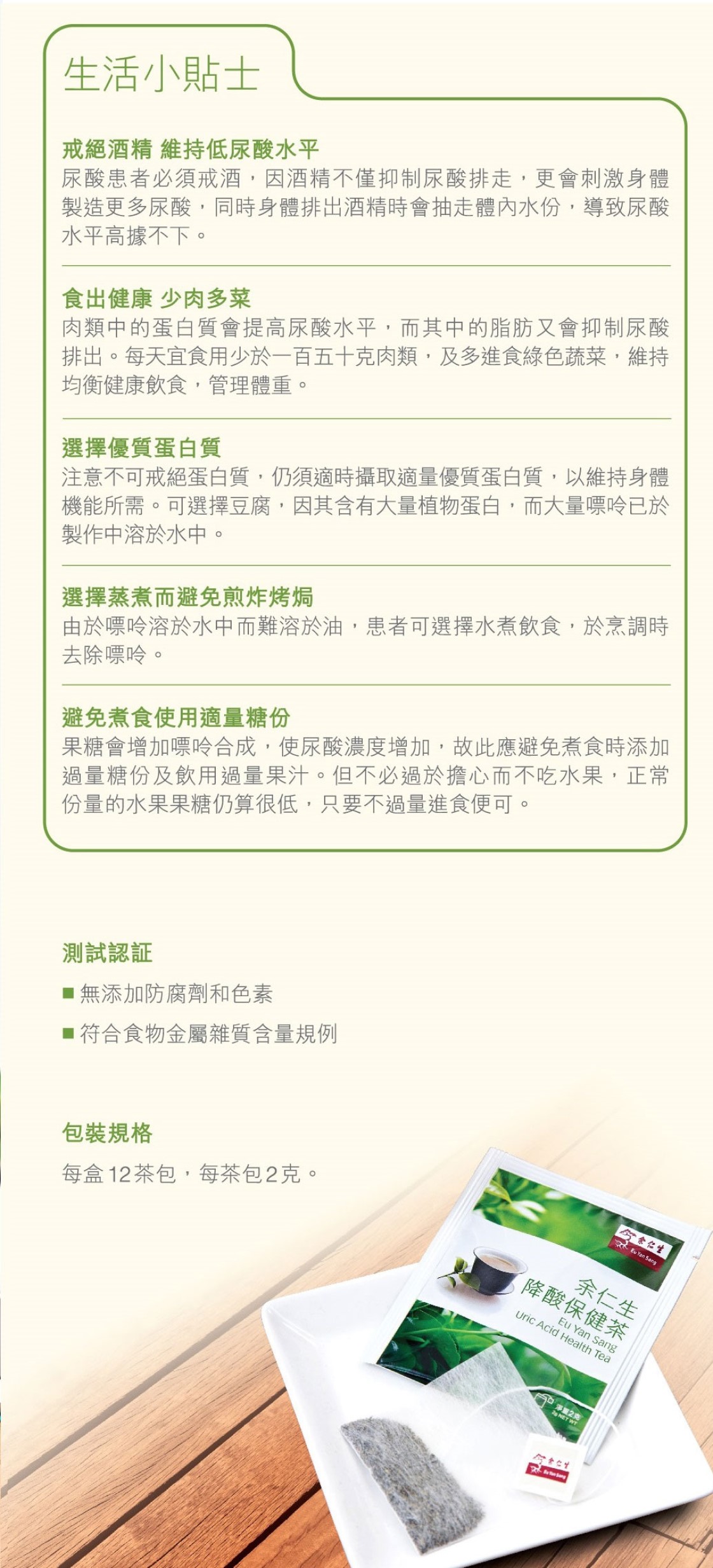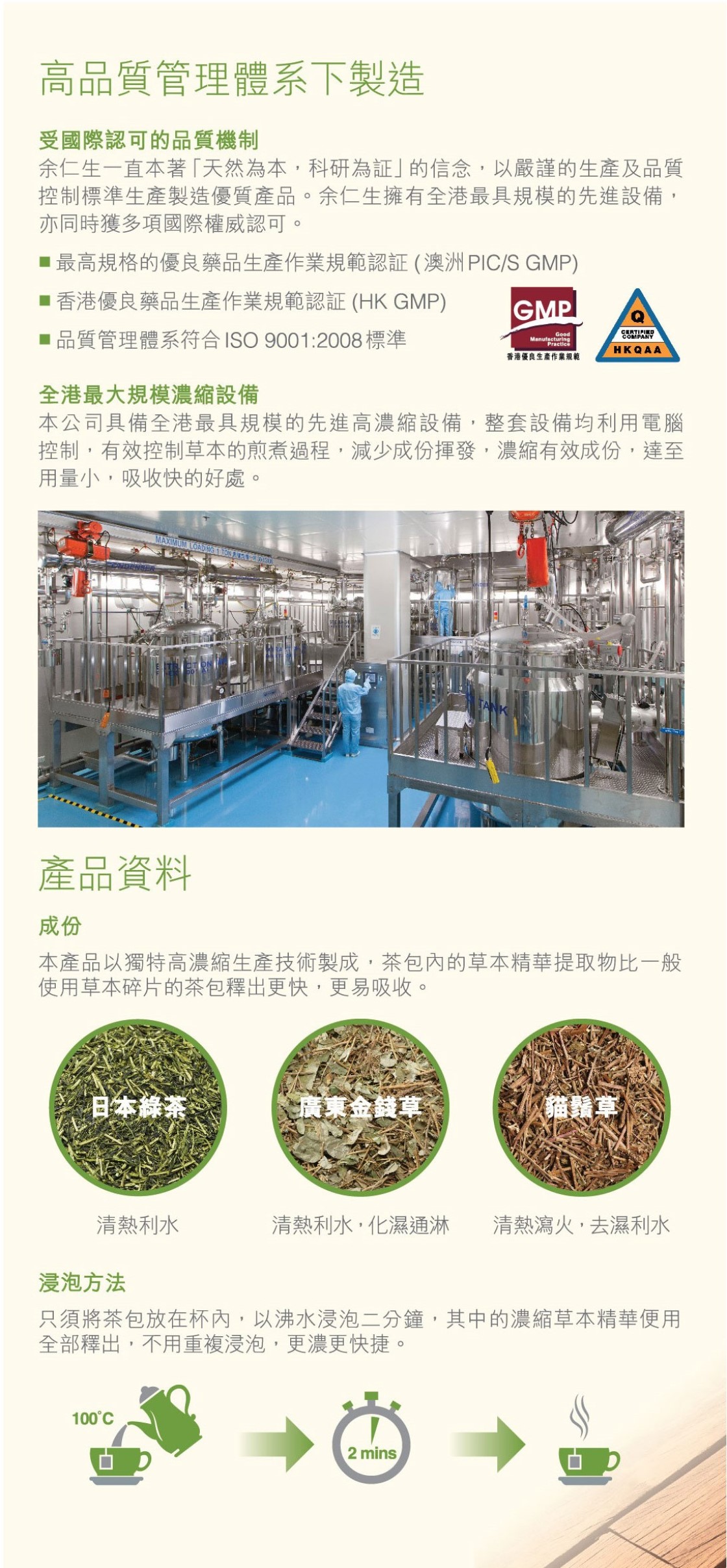 余仁生降酸保健茶採用獨特高濃縮生產技術製成,並經過高溫處理及重金屬測試。