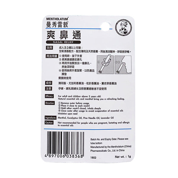 特效配方,迅速疏通鼻塞 能舒解因感冒引起的頭痛、頭暈、流鼻水、打噴嚏及過敏性鼻炎引起的鼻塞 傷風鼻塞時將曼秀雷敦爽鼻通放入一邊鼻孔,再用手指緊按另一鼻孔然後深呼吸,迅速消除傷風鼻塞帶來之不適 |