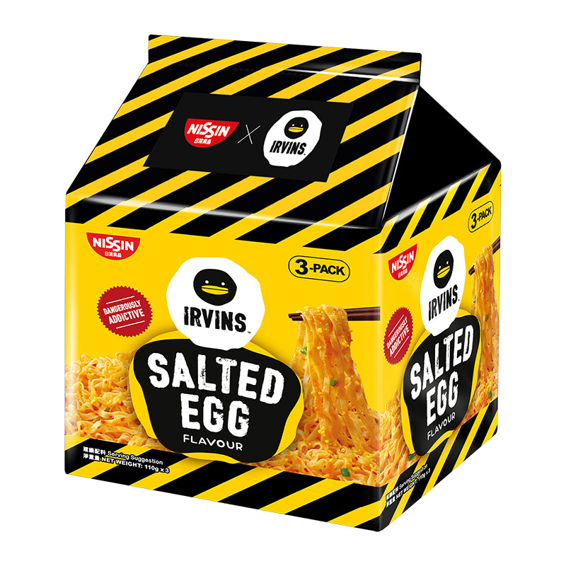 Nissin collaborates with IRVINS to launch a new exquisite instant stir noodle. Taking reference to the famous and traditional Singapore noodles, Mee Pok, we combine flat and bouncy noodles with salted egg flavour seasoning powder, bringing rich and slightly spicy taste to the Nissin collaborates with IRVINS to launch a new exquisite instant stir noodle. Taking reference to the famous and traditional Singapore noodles, Mee Pok, we combine flat and bouncy noodles with salted egg flavour seasoning powder, bringing rich and slightly spicy taste to the consumers. On top of it, we add specially made salted egg flavour seasoning oil to enhance salted egg aroma. Finally, we put salted egg condiment before serving. Combining all these, its unique taste, visual and smell make Nissin x IRVINS Salted Egg Flavour Stir Noodles irresistible.