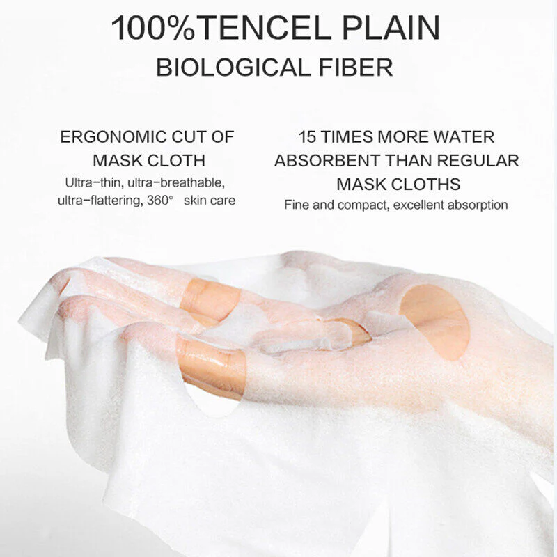 使用天然環保純素面膜紙 具卓越服貼力與彈性 有助於精華吸收與保濕。
