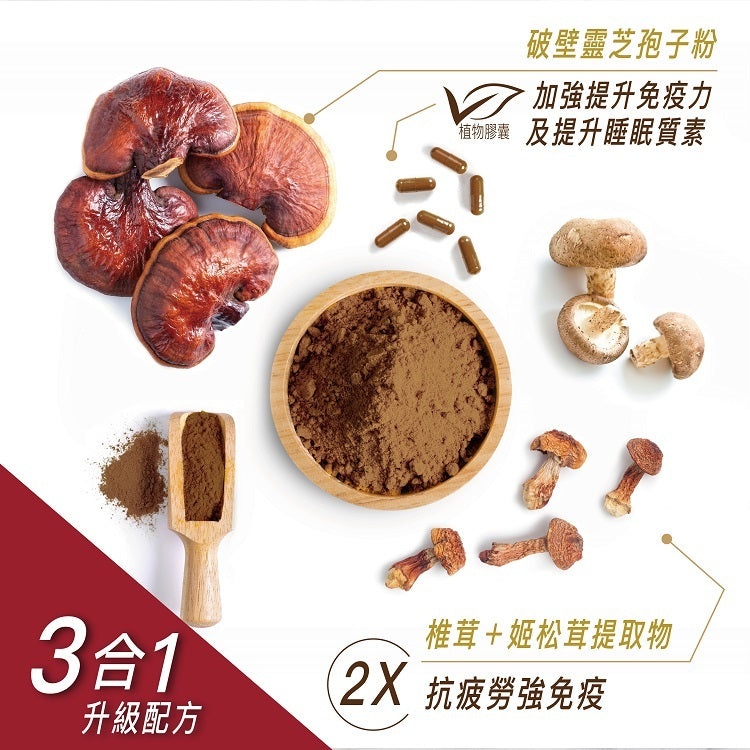 - 三合一升級配方(破壁靈芝孢子粉,椎茸及姬松茸提取物)