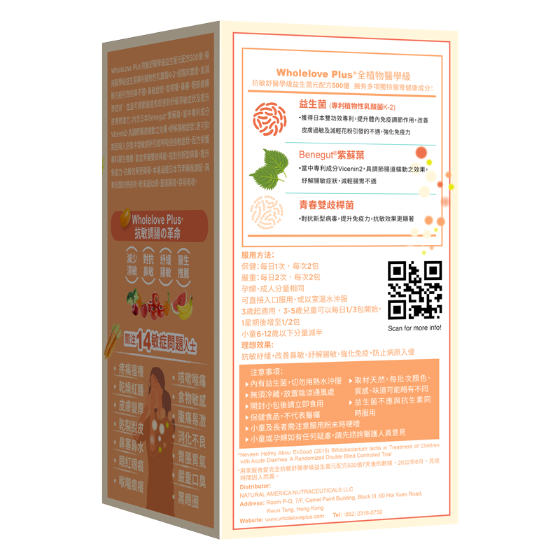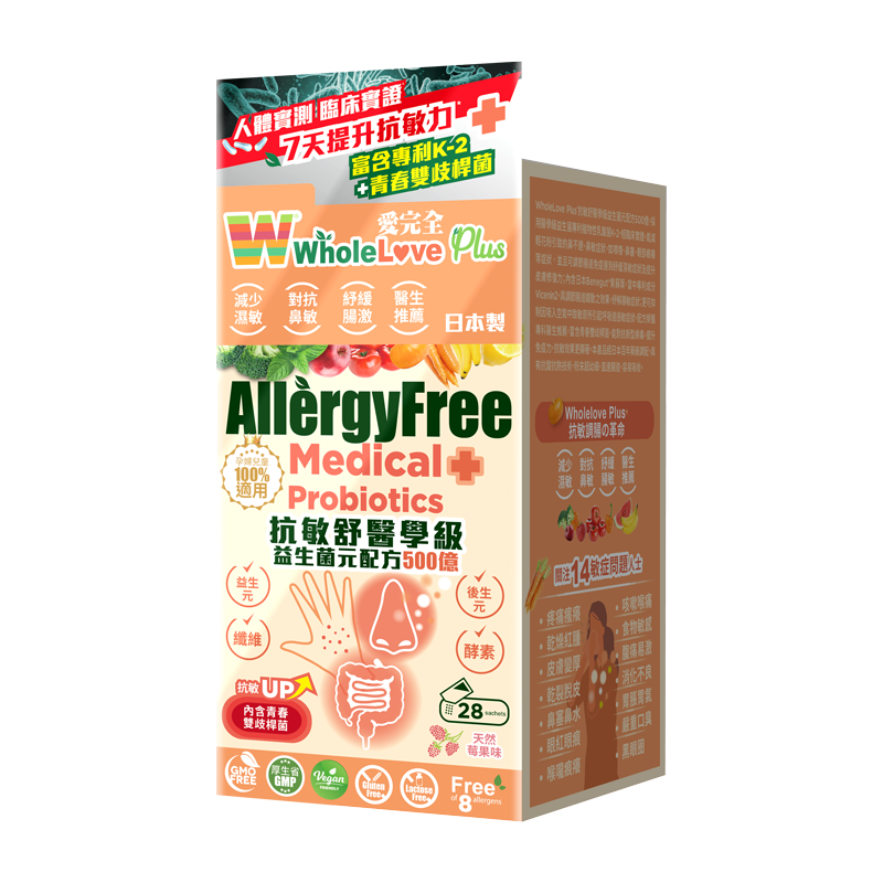 WholeLove Plus 抗敏舒醫學級益生菌元配方500億,採用醫學級益生菌專利植物性乳酸菌K-2,經臨床實證能減輕花粉引致的鼻不適、鼻敏症狀,如噴嚏、鼻塞、眼部痕癢等症狀。配方榮獲專科醫生推薦,富含青春雙歧桿菌,能對抗新型病毒,提升免疫力,抗敏效果更顯著。