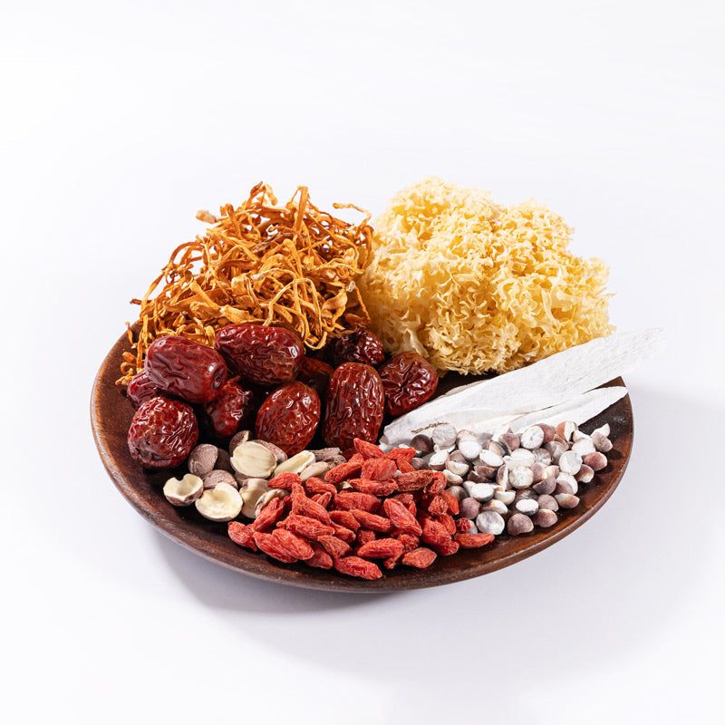 蟲草花,淮山,雪耳,蓮子,紅棗,枸杞,茨實,防腐劑(二氧化硫)