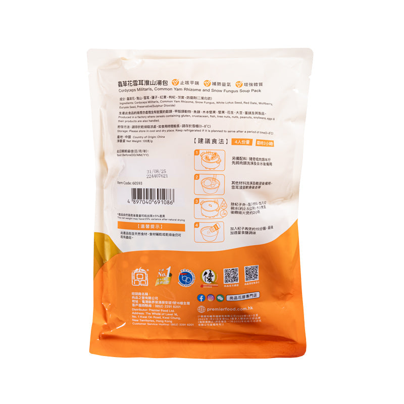 蟲草花雪耳淮山湯包,2-3人份量,做法簡單,製作時間2小時,一次過滿足方便、好味又養生的食療湯包。