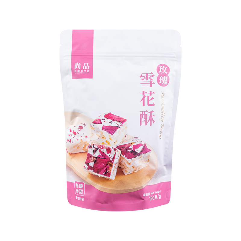 玫瑰雪花酥味道和質感與牛軋糖、白兔糖及牛軋糖不相伯仲、奶香十足,加上淡淡玫瑰清香,又香又酥!