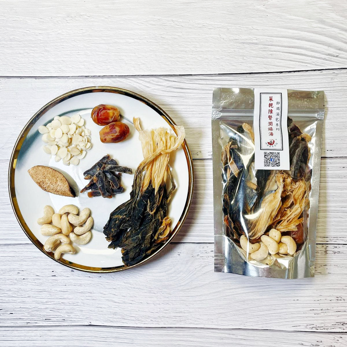 | (為確保儲存更佳,請注意包裝內有乾燥劑,不可食用) 菜乾陳腎潤燥湯(即焗湯包系列) 功效:清肺胃熱、生津潤燥、通便利水 配料:陳腎,菜乾,腰果,椰棗,陳皮,南北杏 淨含量:60克+/-<5克 飲用方法: 將湯料倒入燜燒壺中,倒入滾水清洗一次配料後倒出,再注入滾水700毫升,燜焗2.5小時後即可享用。可按口味加入少量食鹽。 保存方法:雪櫃低溫冷藏。 |