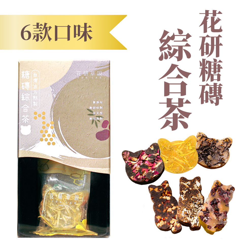 花研糖磚綜合茶有6款茶飲口味,每天隨心情選擇你的貓貓糖磚,達到不同養生效果。嚴選頂級玉林甘蔗,採用正宗台灣古方,經由16道工序匠心熬煮而成。獨立包裝,一杯一粒方便沖泡,可愛貓造型糖磚,讓人倍感療癒,暖意入心。