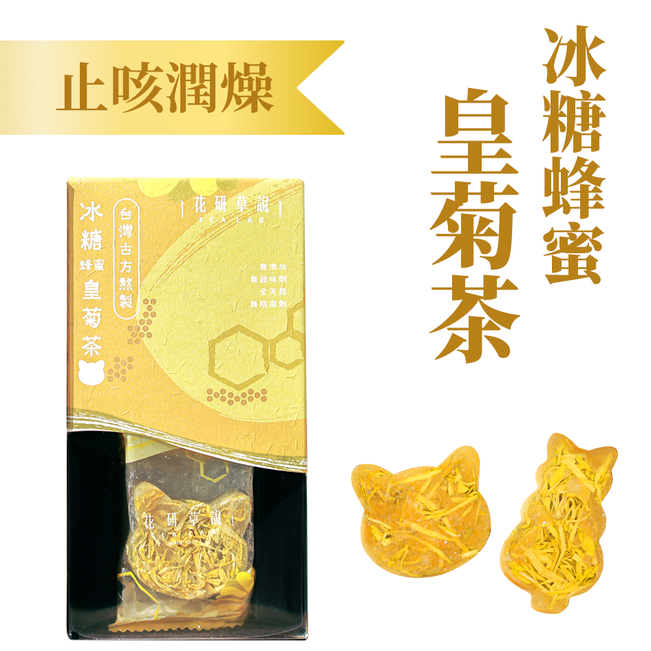 沿用台灣古方熬製,嚴選優質皇菊入茶,配上頂級玉林甘蔗老冰糖及天然蜂蜜,快速止咳潤喉,舒緩喉嚨不適,清熱下火。味道天然甜香,帶點淡淡菊花茶香氣,在家也可享用的特飲,可愛貓咪造型,人見人愛,孩童日常止咳的滋養良飲。
