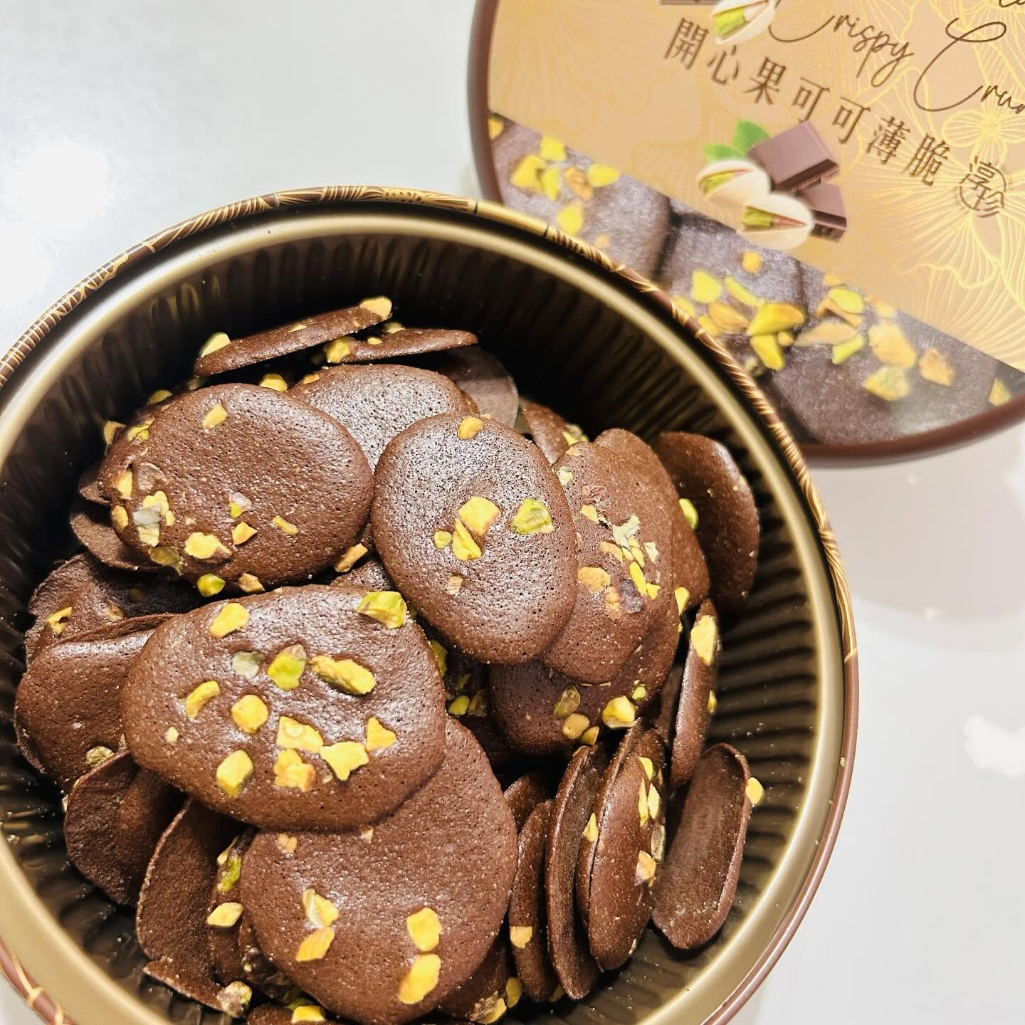 淳珍開心果可可薄脆」為香港製造,採用雙層蜂巢結構,口感極致酥脆。濃郁可可融合開心果碎,味道少甜