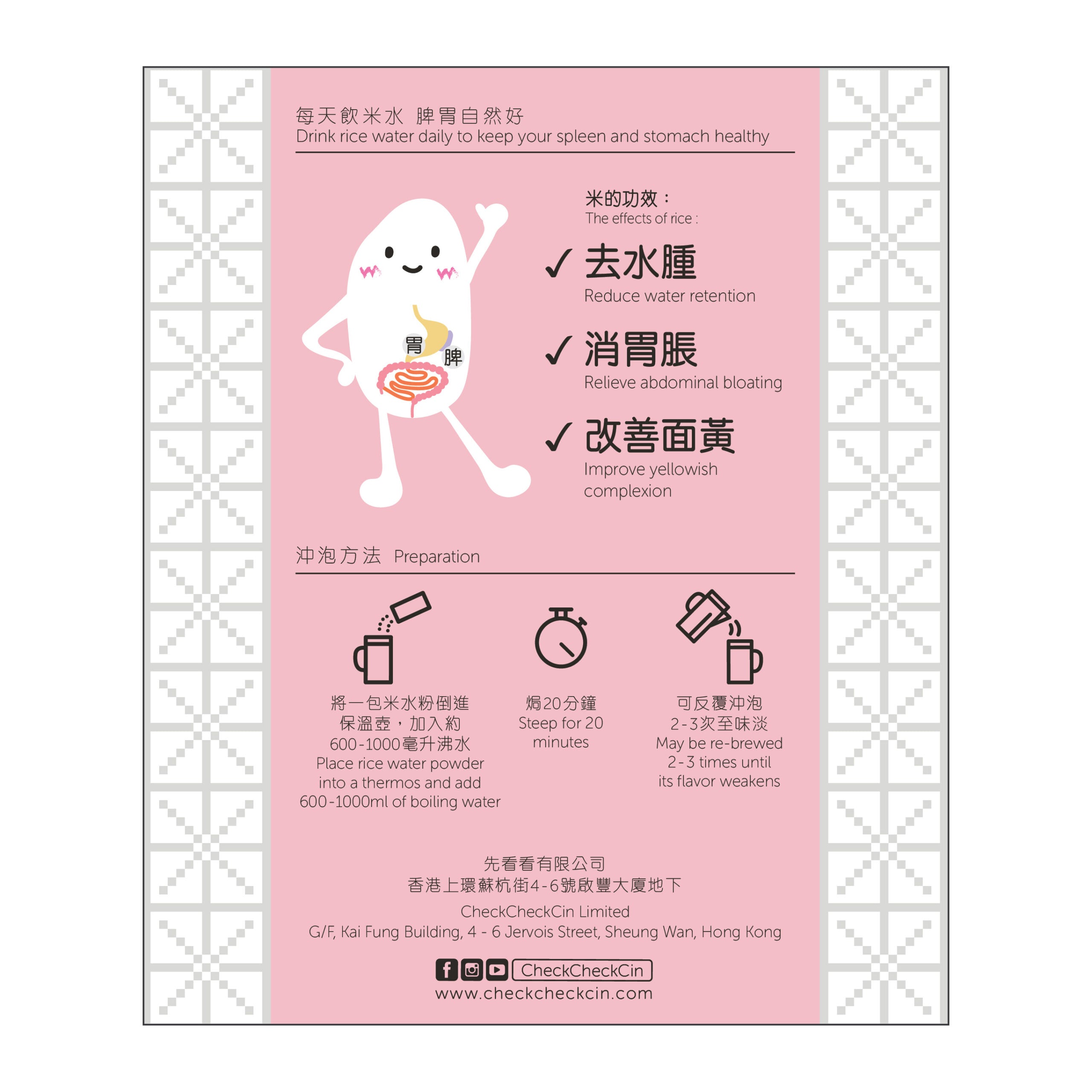 CheckCheckCin小心拿捏米水的比例,製成配方,屬性平和,老少咸宜,志不在增肥,而是讓大家「湊米氣」。都市人生活忙碌,交際應酬在所難免,壓力爆煲時要戒口更是難熬。忙碌會為脾胃添上負擔,建議每天一杯米水,簡單減輕脾胃負擔。